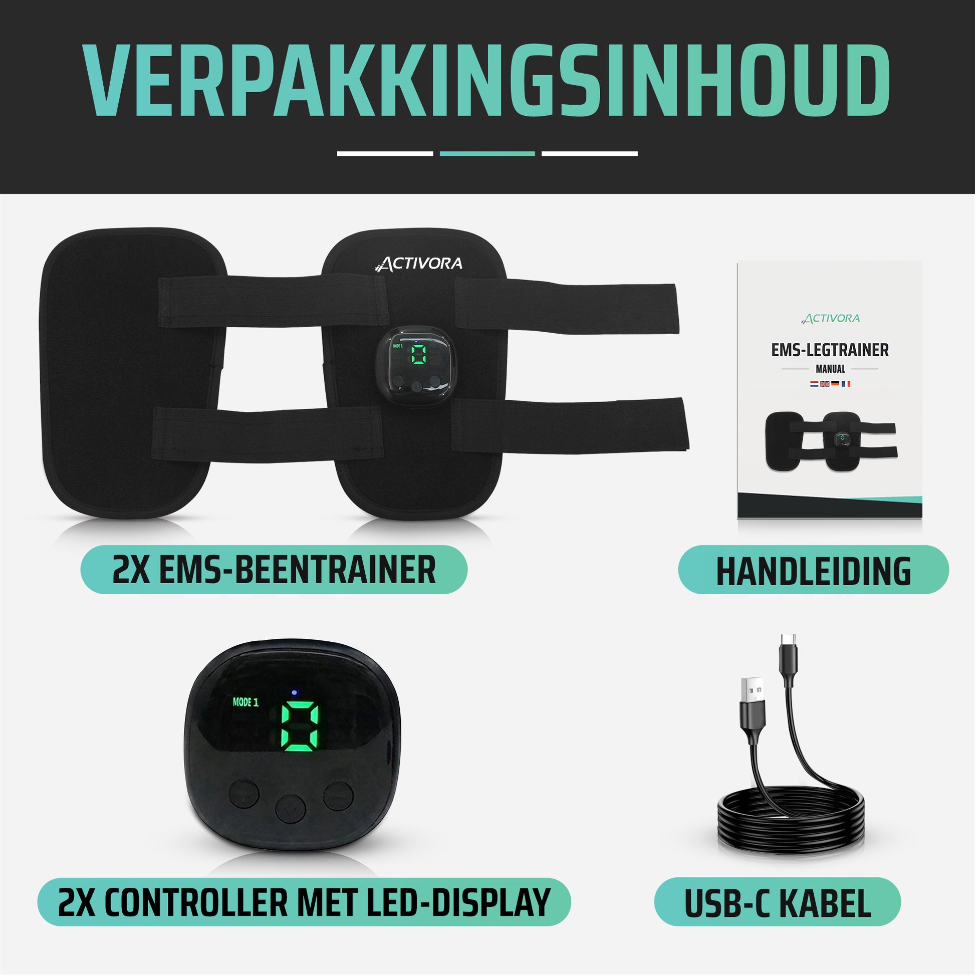 De set bevat twee bovenbeen trainers, een USB-oplaadkabel en een duidelijke handleiding. Alles is direct klaar voor gebruik en eenvoudig aan te brengen op het lichaam.